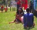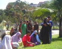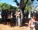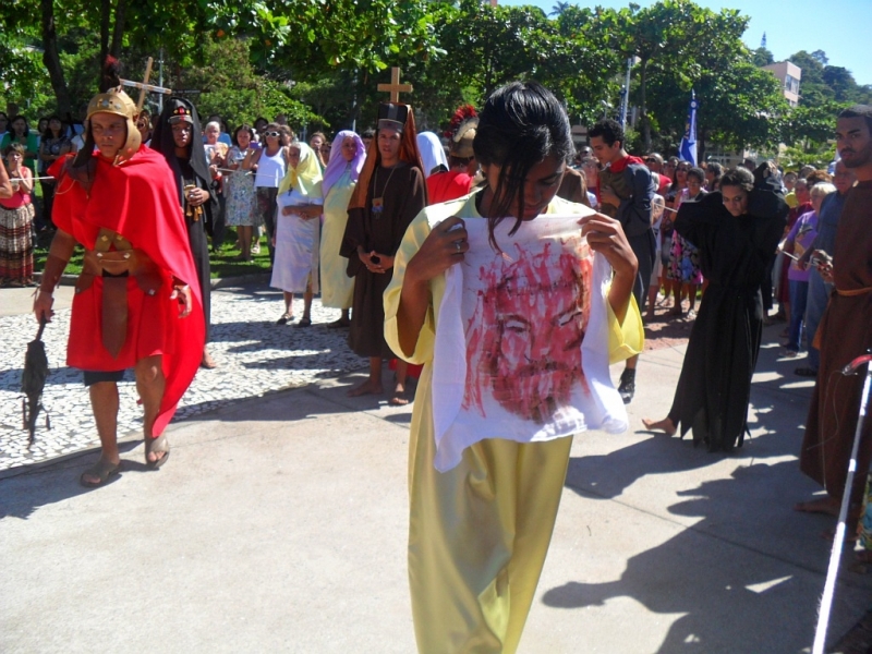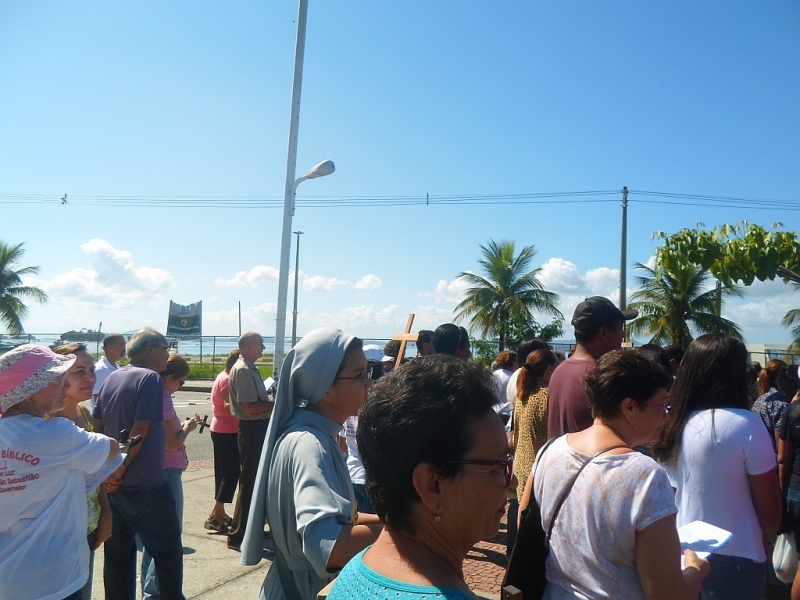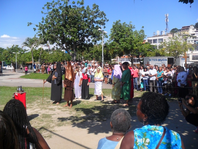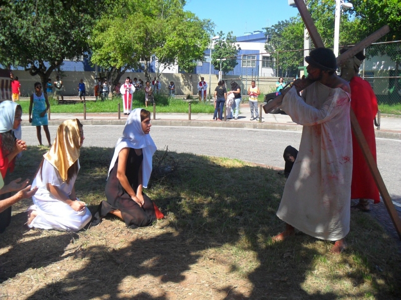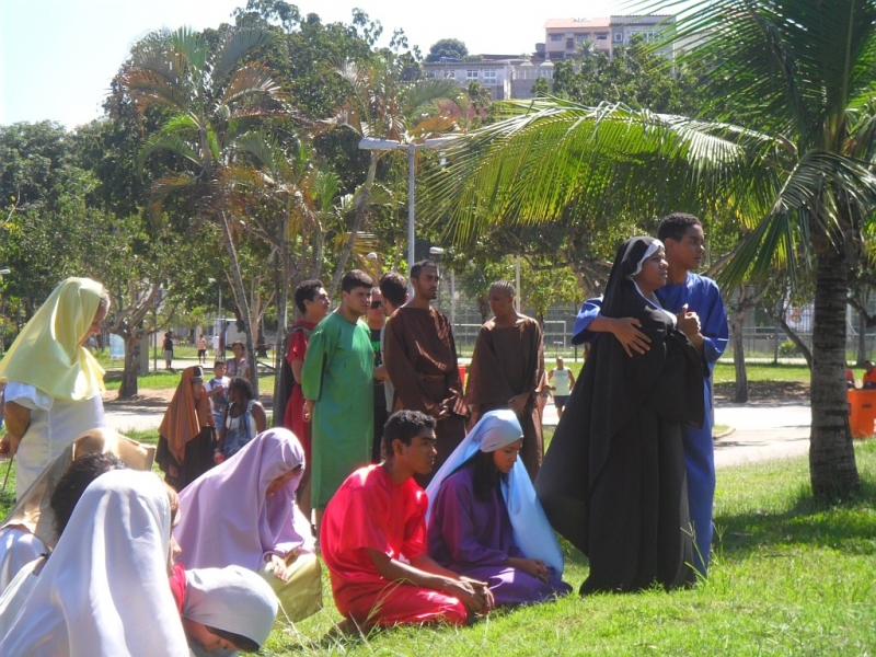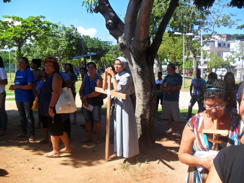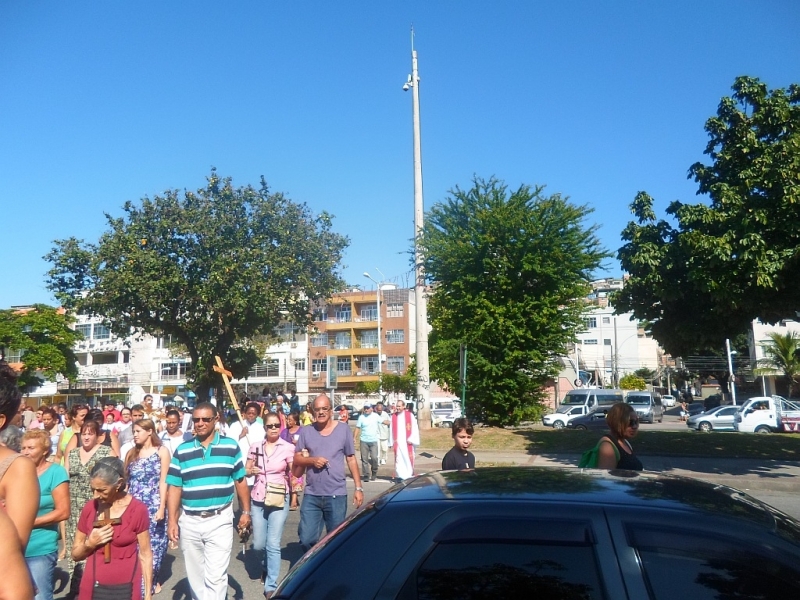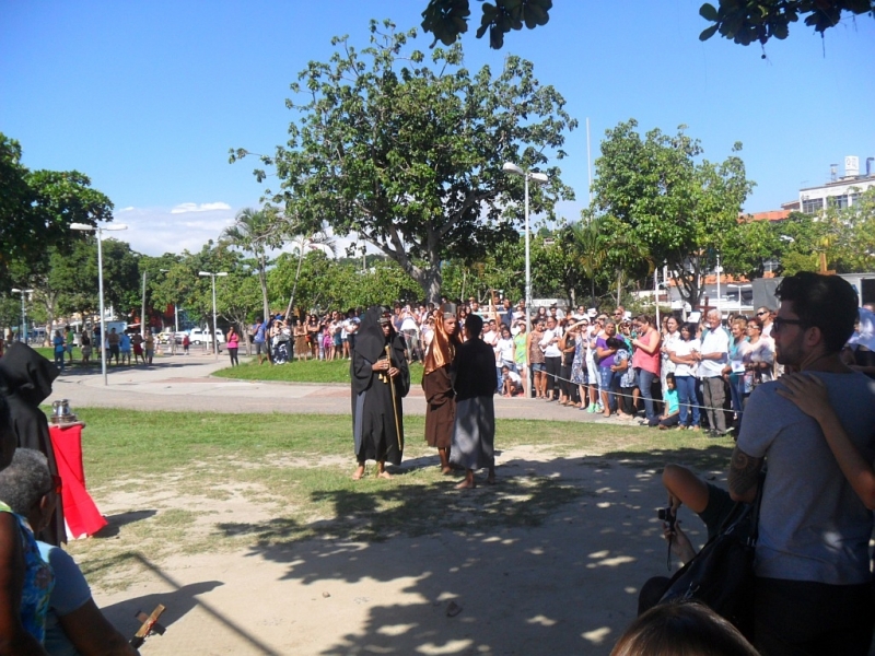 Zebraliśmy się na placu tuż przed kościołem, by potem przejść na właściwy plac. W Drodze Krzyżowej brali udział wszyscy parafianie – nie było Drogi Krzyżowej osobno w kaplicach. Wszyscy uczestnicy mieli mieć swoje krzyże, a liderzy grup parafialnych krzyże z oznakami grupy, którą reprezentują. Na początku ks. proboszcz Marek Dąbkowski poświęcił krzyże. Wielu uczestników zabrało chyba wszystkie krzyże z domu, bo niektórzy mieli nawet po trzy. Jak zwykle nie brakło gapiów, choć ci cichli jak orszak przechodził obok nich. Wielki Piątek jest w Brazylii dniem wolnym od pracy, więc sporo było ludzi na placu, którzy odpoczywali, grali i td.... Pod tym względem niewiele się zmieniło od szeregu już lat…”