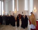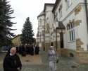 Po obejrzeniu filmu głęboko przeżytego przez Siostry, Pielgrzymi udali się do kaplicy św. Zygmunta w kościele Ojców Franciszkanów, gdzie św. Zygmunt otrzymał Sakrament Chrztu św. Tutaj zostało odprawione krótkie modlitewne rozważanie oraz odmówiona Koronka do św. Zygmunta. Siostry nawiedziły także sąsiadujący z franciszkańską świątynią kościół pw. Przemienienia Pańskiego, w którym – jako niegdyś jedynym kościele parafialnym w Sanoku – znajduje się Księga Chrztów z wpisem o narodzinach i Chrzcie Świętego Zygmunta.