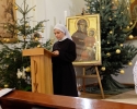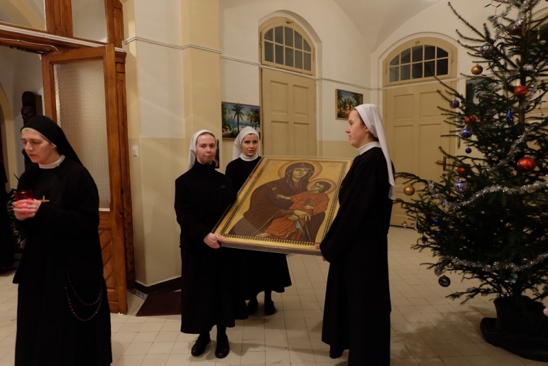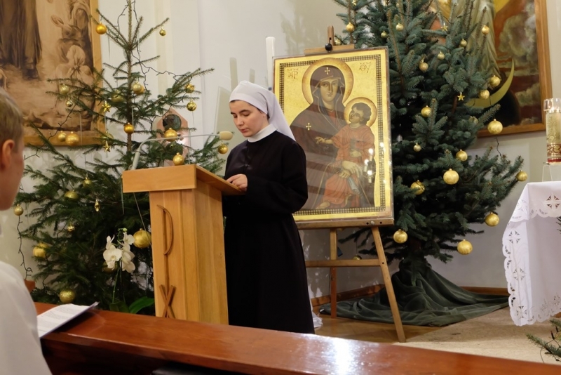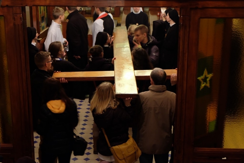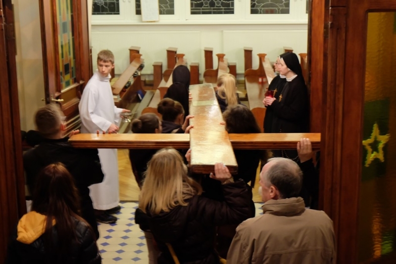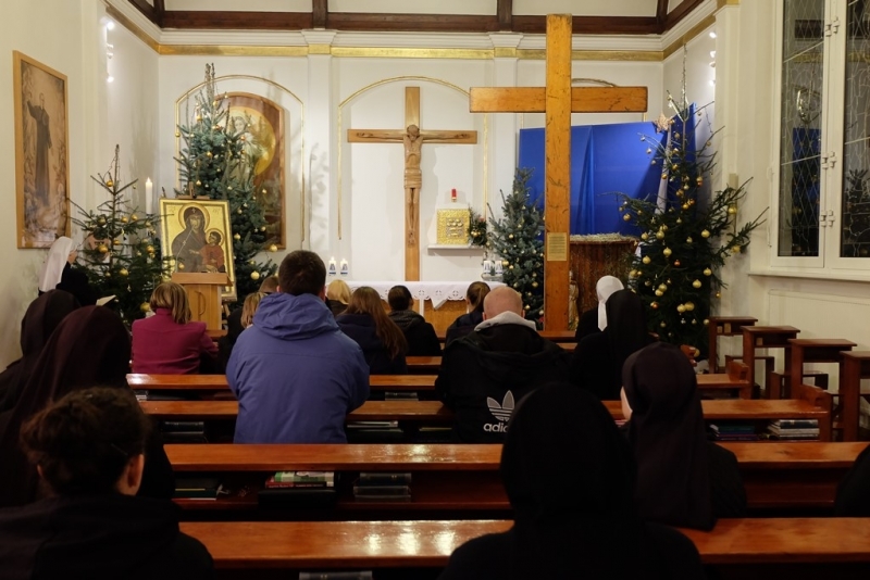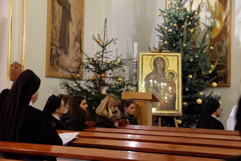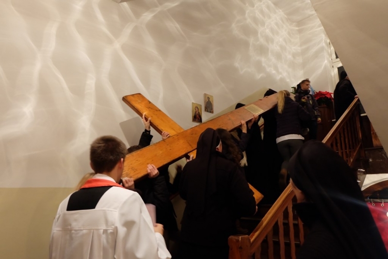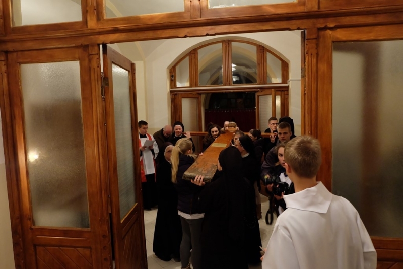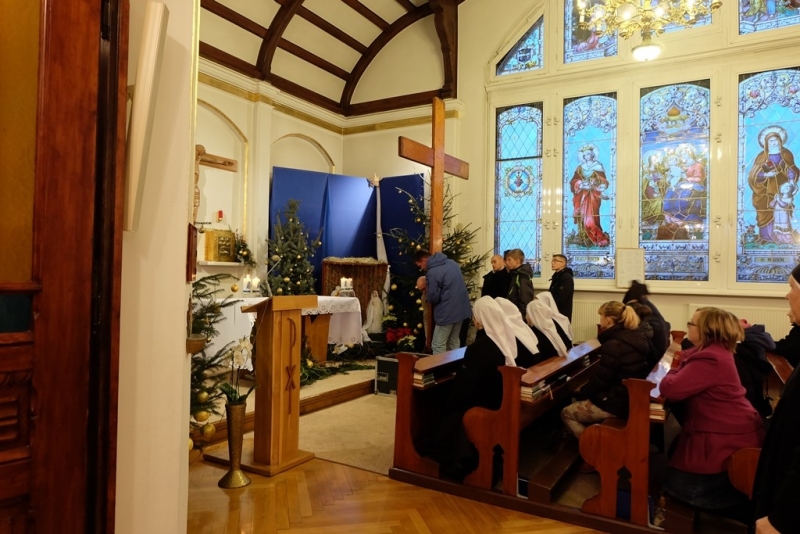 ludzkość i głoście wszystkim, że tylko w Chrystusie umarłym i zmartwychwstałym jest ratunek i odkupienie” oraz Ikona „Salus Populi Romani”. Symbole te zostały wprowadzone procesyjnie do naszego domu. Krzyż niosła młodzież z Siostrami, a Ikonę Maryi Siostry Nowicjuszki. Krzyż został uczczony w trzech miejscach w naszym domu. Pierwszym był hol gdzie modliliśmy się, aby Bóg ochraniał nas mocą krzyża. Drugie uczczenie odbyło się przed kaplicą i trzecie w kaplicy. W kaplicy Krzyż stanął na tle przygotowanego Żłóbka, co pozwoliło nam stanąć przed pełnią Tajemnicy Wcielenia, Krzyża i Eucharystii. Po oddaniu hołdu Krzyżowi S. Przełożona Świerada Machowska CSSJ w imieniu całej wspólnoty wypowiedziała modlitwę: „Panie Jezu Chryste, Ty zapragnąłeś w tajemnicy Twego Krzyża nawiedzić nasz dom wraz ze swoją Matką Maryją. Ty pociągnąłeś każdą z nas do swego Boskiego Serca pokorną miłością i pozwoliłeś, by nasz dom stał się miejscem odkrywania powołania dla naszej młodzieży zakonnej. W roku łaski, czyli w Roku Życia Konsekrowanego jesteś z nami i pozwalasz nam wziąć udział w nieprzebranych bogactwach Twojego Serca i planu zbawienia. Prosimy Cię, niech te godziny spędzone pod Twoim Krzyżem, nocą i w samotności zapowiadającej pełnię zbawienia, staną się źródłem łaski dla każdej z nas, naszej parafii, wszystkich młodych ludzi oraz naszych bliskich”. Następnie odbyła się Liturgia Słowa, a po niej wspólna Adoracja Najświętszego Sakramentu. Razem z nami modliła się kluczborska młodzież oraz osoby zaprzyjaźnione z naszym domem. Po wspólnej Adoracji był czas na indywidualną modlitwę do rana, do godziny 7.00. Nasze czuwanie zakończyła wspólna Eucharystia, po której pożegnaliśmy symbole Światowych Dni Młodzieży. Niech będzie Bóg uwielbiony w swoim planie zbawienia, w Jego przychodzeniu do każdego.”