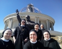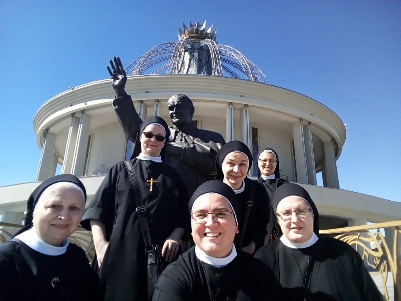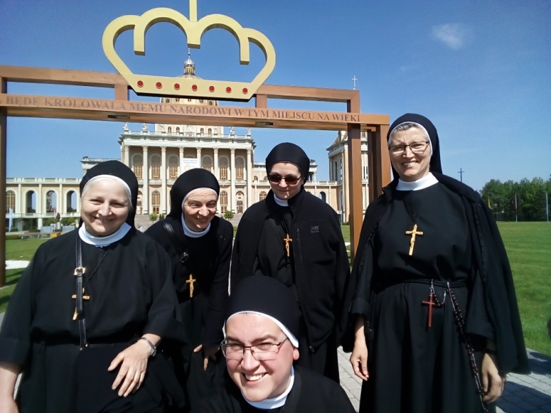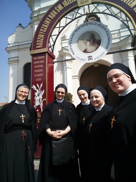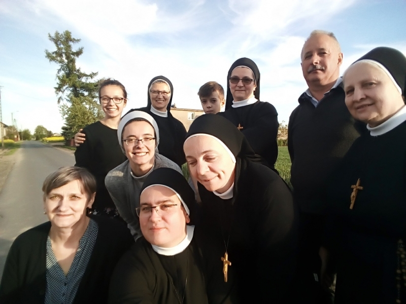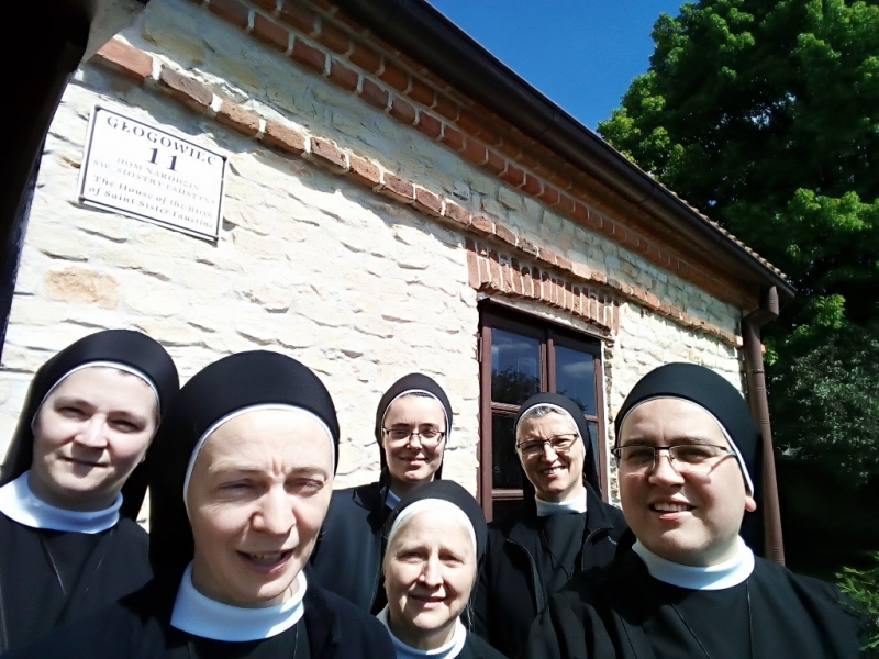 które każda miała w swoim sercu. Kolejne spotkanie było z Matką Bożą w Licheniu, gdzie w ubiegłym roku odbyły się obchody złotego jubileuszu Koronacji Cudownego Obrazu. Dojechałyśmy szczęśliwie do Torunia, gdzie skorzystałyśmy z gościnności naszych Sióstr. Otwartość i radość ze spotkania wspólnotowego była tak wielka, że razem wybrałyśmy się na wieczorne zwiedzanie Torunia. W sobotę 5 maja rozpoczęłyśmy Mszą św. w parafii pw. św. Józefa, a po niej wraz S. Luizą CSSJ pojechałyśmy do Sanktuarium NMP Gwiazdy Nowej Ewangelizacji i św. Jana Pawła II. Wdzięczne toruńskiej wspólnocie Sióstr pożegnałyśmy to miasto udając się w kierunku Matki Bożej Bolesnej w Oborach, gdzie z racji pierwszej soboty miesiąca włączyłyśmy się w Wieczernik Królowej Pokoju. Nie mogłyśmy w nim uczestniczyć do końca, ponieważ miałyśmy zarezerwowane wejście do Muzeum, które mieści się przy Sanktuarium Męczeństwa bł. ks. Jerzego Popiełuszki przy włocławskiej Tamie. Pełne wdzięczności i przeżyć dojechałyśmy do Kujawki, gdzie przy drodze wyczekiwała na nas S. Michalina CSSJ ze swą Rodzinką. Radość spotkania w tym szerokim gronie trwała do następnego dnia i na długo pozostanie w naszych sercach. W niedzielę 6 maja z rana wyruszyłyśmy na Mszę św. do Sanktuarium urodzin i Chrztu św. Faustyny Kowalskiej w Świnicach Warckich. Po uroczystej Eucharystii Ks. prob. Janusz Kowalski opowiedział nam o historii tego miejsca i wspomniał, że ta niewielka świątynia jest świadkiem wielu małych i wielkich spotkań ludzi z Panem Bogiem. W kościele tym znajduje się konfesjonał, w którym Helenka Kowalska odbyła pierwszą spowiedź oraz chrzcielnica i świadectwo jej Chrztu spisane w języku rosyjskim. W tej świątyni Chrystus zwrócił się do tej Helenki z Głogowca, słowami: „WYBRANKO MOJA” (Dz. 400) i dał odczuć potęgę swojej Miłości. Na trzy lata przed powołaniem jej do Nieba złożył obietnicę: „UDZIELĘ CI JESZCZE WIĘKSZYCH ŁASK, ABYŚ BYŁA ŚWIADKIEM PRZEZ CAŁĄ WIECZNOŚĆ NIESKOŃCZONEGO MIŁOSIERDZIA MOJEGO” (Dz. 400). Słowa te umieszczone są nad prezbiterium. Ponad dwa kilometry dalej mieści się Dom Rodzinny w Głogowcu, który jest cząstką Sanktuarium jej urodzin i Chrztu. Pełne przeżyć duchowych i wspólnotowych wróciłyśmy do polanickiego kurortu. Bogu niech będą dzięki za tę możliwość bycia we wspólnocie, w jedności ze sobą i z Siostrami, które pozostały w domu.