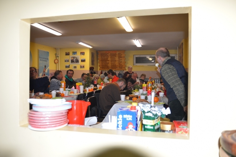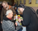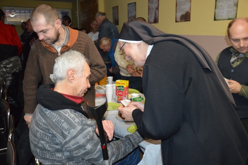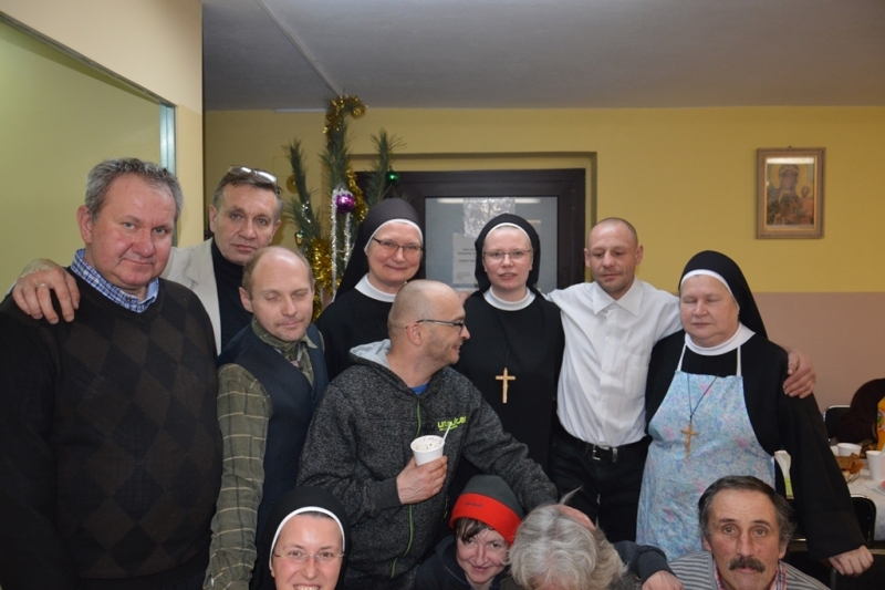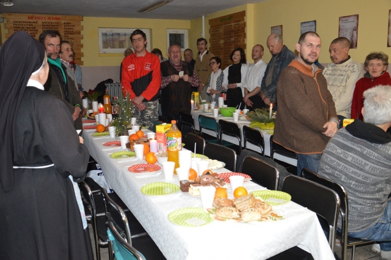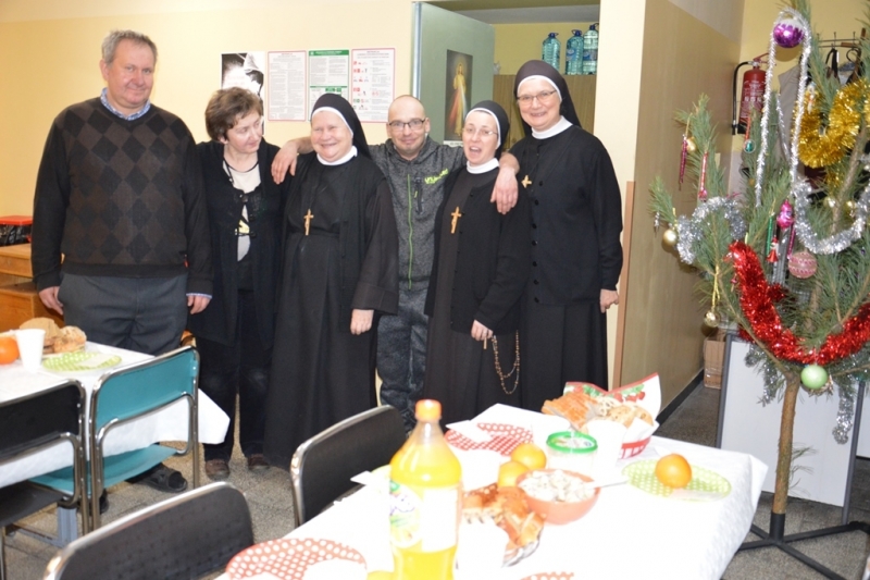 Siostry dołączyły, aby pomóc w przygotowaniach i choć przez chwilę pobyć z najbardziej ubogimi naszego miasta. W Wigilii wzięło udział około 40 osób – młodszych i starszych, schorowanych, samotnych, nie mających ani z kim ani gdzie połamać się opłatkiem. Po odczytaniu fragmentu z Ewangelii i zaśpiewaniu kolędy ze wzruszeniem, łzami w oczach łamaliśmy się białym kawałkiem opłatka…Dzięki otwartym sercom wielu osób, które ofiarowały dary na tę wieczerzę, można było przygotować i „zastawić” stół z najważniejszymi potrawami wieczerzy wigilijnej. Wystarczyło też jedzenia, aby choć niektórzy mogli zapełnić przyniesione ze sobą pojemniczki… Chwała Panu za radość i uśmiech, które na chwilę zagościły na ustach biednych. Zobaczyłyśmy też, jak bardzo ci ubodzy, są wdzięczni s. Millenie, za wszystko, co dla nich czyni…, nazywają Siostrę „promykiem Bożej miłości”…