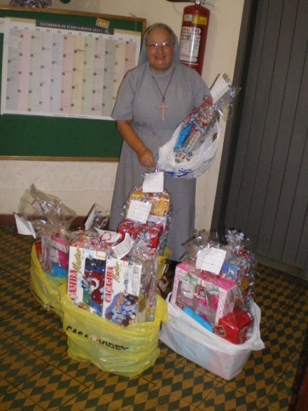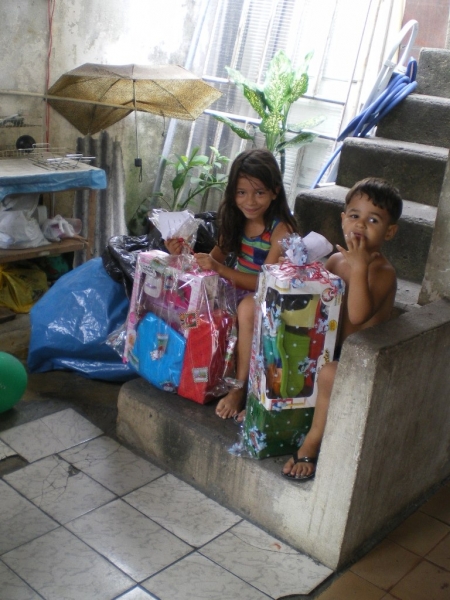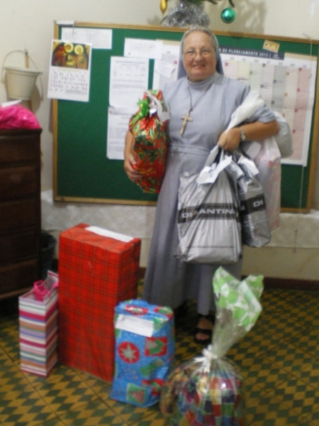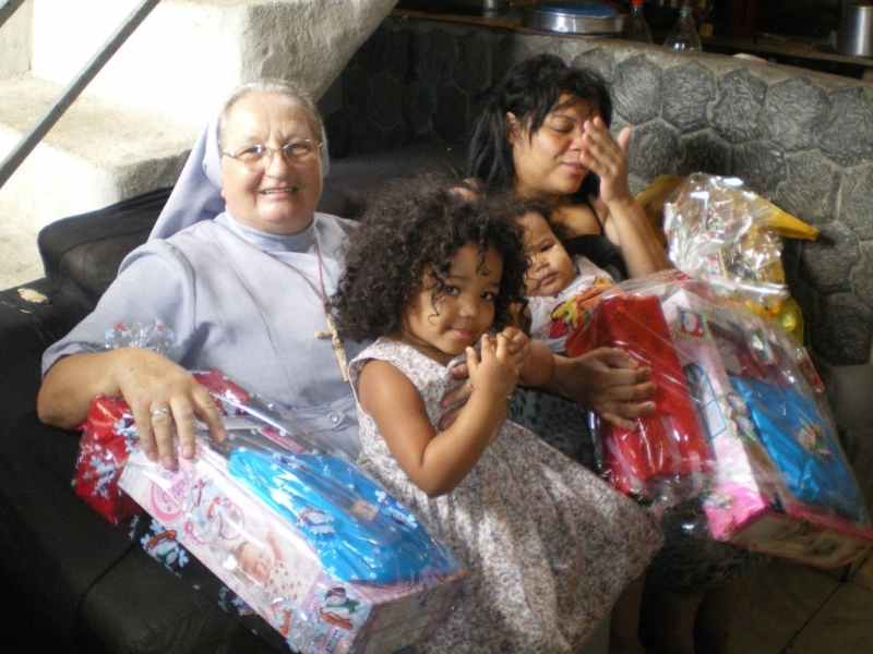 Jest to prawdziwe dobrodziejstwo wobec potrzebujących. Jednocześnie wiąże się to z nie lada wyzwaniem przyprowadzającym niemal do bólu głowy, bo trzeba znaleźć szczególnie biedne dzieci, spisać ich personalia i udostępnić je przybranym “chrzestnym”, którzy JE ubiorą. W związku z tym obdarowywaniem w ubiegłym roku było parę nieprzyjemności, bo jedne dzieci patrząc na prezenty innych chciałyby, aby dostać lepsze niż to co im przypadło. W związku z tym, w tym roku postanowiłam zaniechać tej pracy. Tymczasem, kiedy przyszłam jednego listopadowego dnia do domu, Siostra Dobrosława oznajmiła mi, że dzwoniła Pani, ktora chce ubrać 18 dzieci i zostawiała mi swój numer telefonu. Oczywiście, zaraz “zmiękło mi serce” i podjęłam zaniechaną pracę ponownie. Zadzwoniłam do tej Pani i okazało się, że to jest siostra pewnego Księdza Biskupa – ale spoza Rio. Ponieważ roznoszę Komunię św. chorym do Szpitala pw. św. Marii Magdaleny, zatrudniona tam Pani Doktór pediatra oświadczyła mi także, że może ubrać 12 dzieci. I tak, do dnia 1 grudnia miałam już na liście 54 dzieci i paczki dla nich. Zazwyczaj każdy ofiarodawca chce widzieć radość dzieci z otrzymanych prezentów. Zaprosiłam zatem Panią Doktór, by poszła ze mną na favele, żeby zobaczyć jak to wszystko wygląda. Moją intencją było, by mogła ona objąć pomocą lekarską te biedne dzieci. Niestety, to pragnienie się nie zrealizowało, bo w wyznaczonym dniu zmarła jej mama. Tak więc, zostawię ten projekt na najbliższy czas. Prezenty musiałam roznieść dzieciom osobiście do ich domów, bo do kaplicy dzieci nie przyjdą ponieważ boją się, że któreś z nich może nie otrzymać paczki. Natomiast jak siostra sama przyjdzie do domu, to na pewno taką paczkę przyniesie. Proszę o modlitwę za tych, co otrzymali paczki i za tych co je przygotowali.