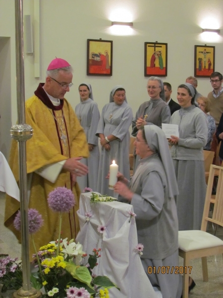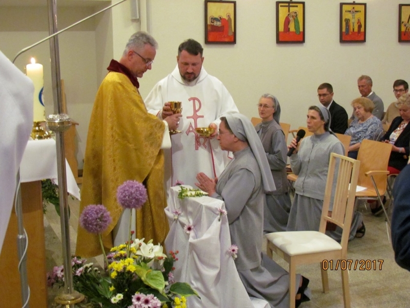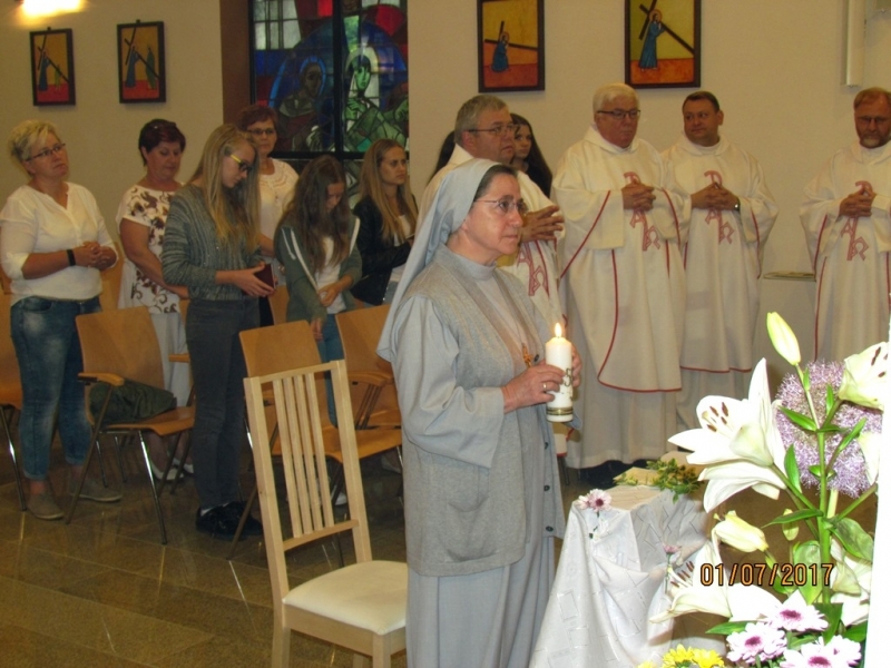 Jubileuszowej Mszy św. przewodniczył Ks. Bp Wiesław Lechowicz, Delegat Komisji Episkopatu ds. Duszpasterstwa Emigracji Polskiej. We Mszy św. uczestniczyli oprócz mieszkańców Domu także zaproszeni goście – Księża z okolicznych Ośrodków Polonijnych, Krewni Siostry Jubilatki, Polacy i Niemcy z okolicznych miejscowości. S. Antonella w trakcie Eucharystii odnowiła śluby zakonne złożone po raz pierwszy 50.lat temu, a: Ks. Biskup złożył Siostrze podziękowanie za wierną realizację powołania na wzór Abrahama, który dostrzegł obecność Boga w swoim życiu, okazał Mu gościnę i posłuszeństwo, dzięki czemu mógł się cieszyć obfitością życia mierzoną nie tylko latami. Słowa wdzięczności skierował też dyrektor Domu Ks. Damian Lewiński, kapłan diecezji pelplińskiej, główny organizator i gospodarz tego świętowania.